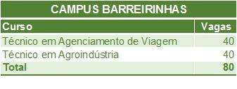 O Instituto Federal do Maranhão (IFMA) Campus Barreirinhas oferece 80 vagas no processo seletivo para ingresso nos cursos da Educação Profissional Técnica de Nível Médio, em 2016. As inscrições vão de 10 a 30 de setembro de 2015. A prova será realizada no dia 29 de novembro de 2015.